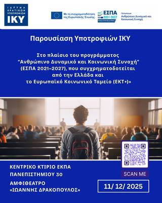 Σας προσκαλούμε σε ημερίδα παρουσίασης των προγραμμάτων υποτροφιών του ΙΚΥ η οποία θα πραγματοποιηθεί στην Αθήνα, στο Κεντρικό κτήριο του ΕΚΠΑ (Πανεπιστημίου 30), στο αμφιθέατρο «Ιωάννης Δρακόπουλος»,